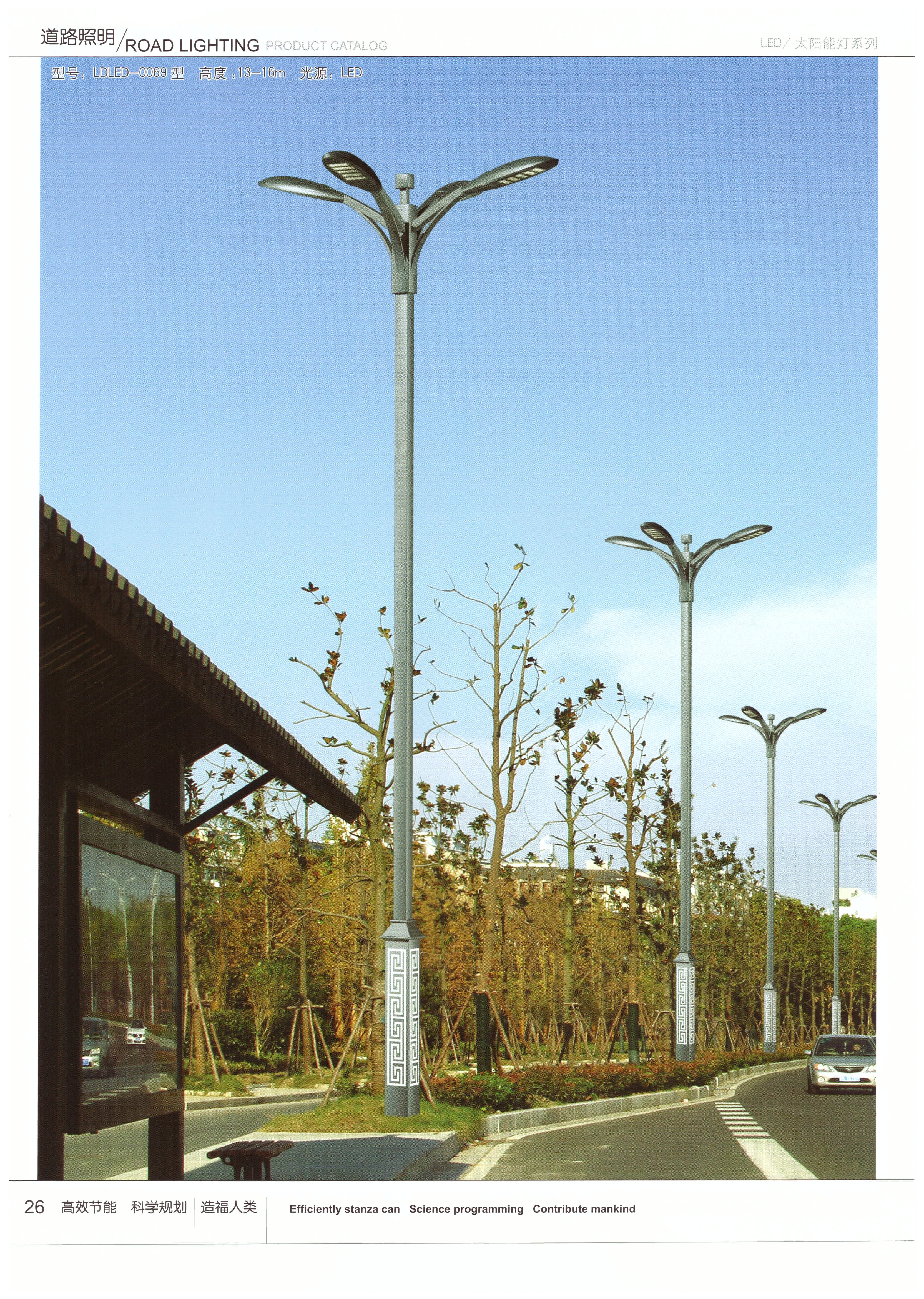4、LED:LED燈光源,壽命長,可達1000000小時,工作電壓低,不需要逆變器,光效較高,國產50Lm/w,進口80Lm/w,隨著技術進步,LED的性能將進一步提高。LED作為太陽能路燈的光源將是一種趨勢。