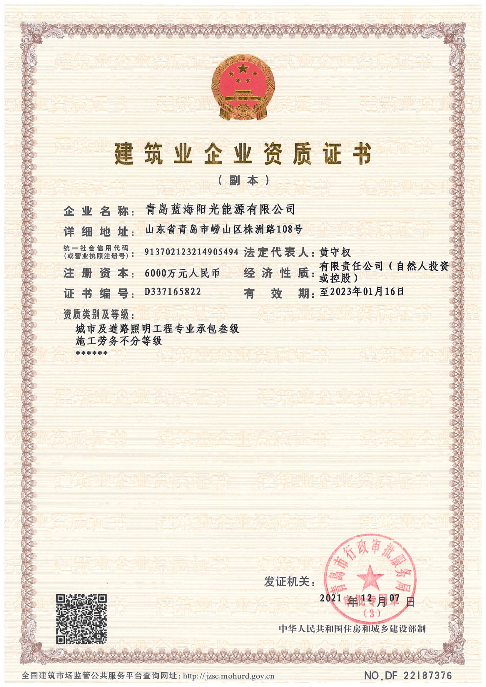 ? ? ? ?青島藍(lán)海陽(yáng)光能源有限公司是專業(yè)從事戶外照明工程設(shè)計(jì)、規(guī)劃與施工一體的專業(yè)化企業(yè)。具有道路照明專業(yè)承包資質(zhì),屬于青島市高新技術(shù)企業(yè)、科技型中小企業(yè),公司通過(guò)了ISO9001管理體系認(rèn)證和ISO1400、ISO1800體系認(rèn)證。? ? ? ?公司有多項(xiàng)照明亮化案例,設(shè)計(jì)